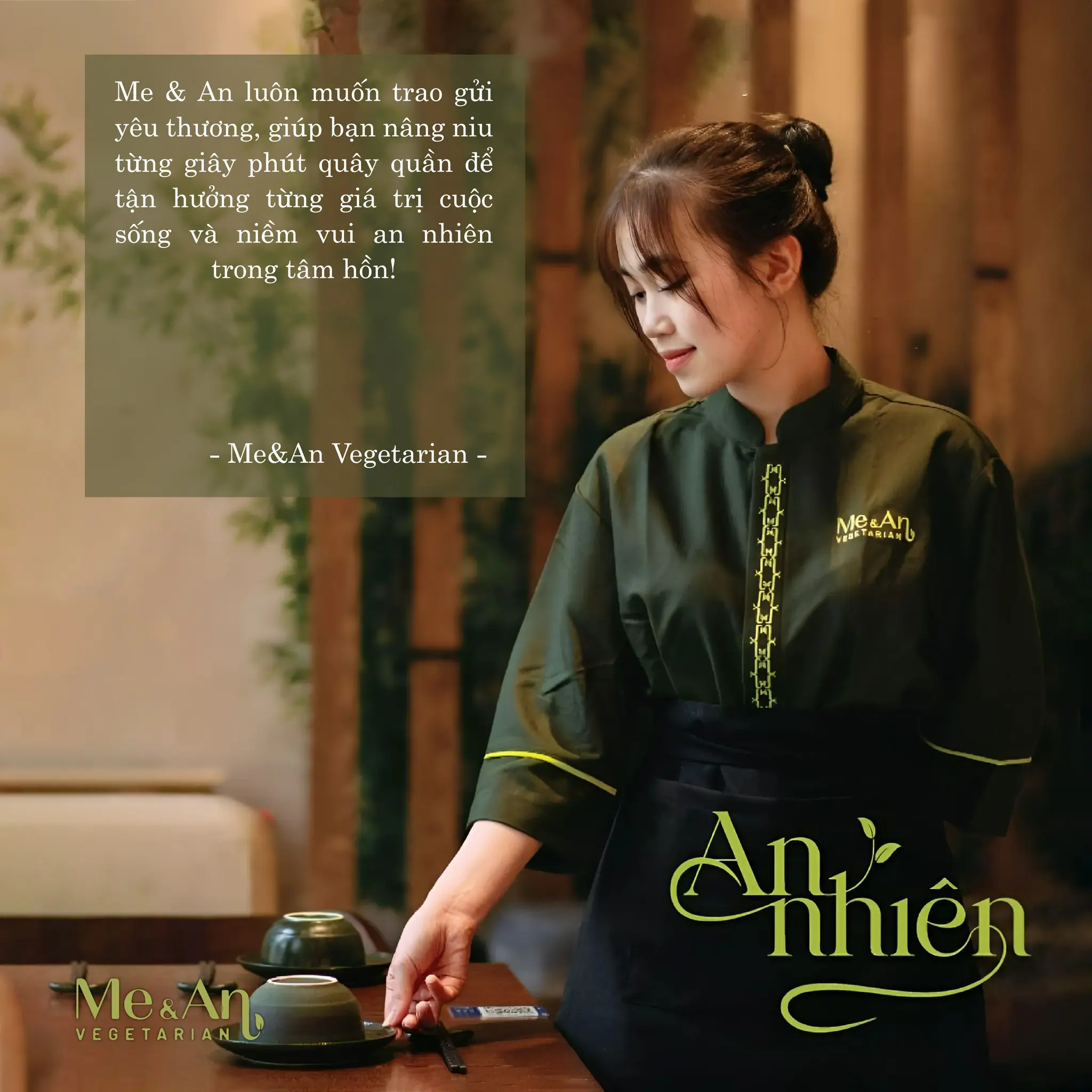 “Me&An Vegetarian – Tâm an khởi lạc với ẩm thực chay tinh tế và Đồng phục công sở.” Nhà hàng chay Me&An tại Hàm Long mang đến không gian ấm áp, món ăn ngon và sự tận tâm trong từng chi tiết. Đồng phục công sở tự hào đồng hành cùng Me&An, cung cấp đồng phục chất lượng, góp phần tạo nên trải nghiệm ẩm thực trọn vẹn cho thực khách.
