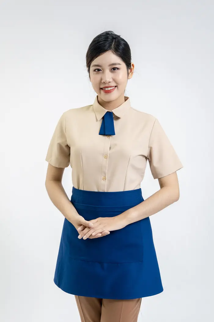 Nhà hàng, khách sạn thường lựa chọn thiết kế tạp dề đồng phục đa dạng hơn, dài hoặc ngắn tùy vào từng bộ phận. Song, điểm chung là chất liệu luôn phải thoáng mát, bền đẹp và cho cảm giác dễ chịu khi mặc. Phía trước thường bố trí túi lớn để đựng các dụng cụ cần thiết cho công việc như khăn lau, bút, sổ tay,… Màu sắc trung tính như trắng, đen kết hợp với logo doanh nghiệp được in/thêu sắc nét, bắt mắt.